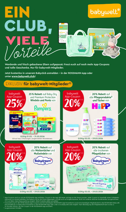 Bitte beachten Sie, dass dieser Text automatisch generiert wird und möglicherweise Fehler enthältbabyuwelt* ve ue CLUB, AA # À En V =. Werdende und frisch gebackene Eltern aufgepasst: Freut euch auf noch mehr App-Coupons und tolle Geschenke. Nur für babywelt-Mitglieder. Jetzt kostenlos in unserem Babyclub anmelden - in der ROSSMANN-App oder unter www.babywelt.club! babywelt 25% Rabatt auf Baby-Dry babywelt 20% Rabatt auf App-Coupon und Premium Protection App-Coupon alle Pflegeprodukte” Windeln und Pants von und Tücher von 20%, F1 25%, a LUS DST a 2 33353 31.03.2026 Gilt auf max Gültig 01.03 mm M jonat: Gültig 02.03. - 29.03.2026 babywelt 20% Rabatt auf babywelt 20% Rabatt auf App-Coupon alle Moltontücher und App-Coupon alle trockenen Mullwindeln von Pflegetüi cher von & 20% © ED : à re Gültig 02.03. - 29.03.2026 Gültig 02.03. - 29.03.2026 App-Coupons sind nur mit der ROSSMANN-App einlösbar. Coupon in der App aktivieren und App an der Kasse scannen. Jeder Coupon ist innerhalb seines Gültigkeits- Zeitraums nur einmal einlösbar. Der Rabatt wird an der Kasse abgezogen und gilt auch auf Angebotspreise. Nicht mit anderen Aktionen kombinierbar (ausgenommen 10% auf alles). Keine Barauszahlung möglich. Bitte Produkte selbst auswählen. Voraussetzung für den Erhalt dieses App-Coupons sind ein bestätigtes ROSSMANN-App-Nutzerkonto sowie eine bestätigte Mitgliedschaft in der ROSSMANN babywelt, 24 Stunden dauern, bis der Coupon in der ROSSMANN-App erscheint. Die Anmeldung zur babywelt ist kostenlos in der ROSSMANN-App oder unter www.babywelt.club möglich. Nach Bestätigung der Mitgliedschaft kann es bis zu ‚Ausgenommen Windeln.