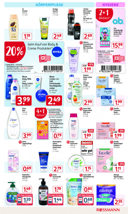 Bitte beachten Sie, dass dieser Text automatisch generiert wird und möglicherweise Fehler enthältKORPERPFLEGE HYGIENE Kneipp L'Oréal Dusche Dusche Men Expert 250 ml 200 ml Deospray 112476 EDS 150 mL D EN oder Deo Roll-on 2 50 ml ° 1121293/5280 18 uen ob Je or Em ob. % En al ob. Periodenslip Ban Me GröBe XS/S bis XL/XXL 4 je Stück Es) 7 Alterra EE] beim Kauf von Body & Aromadusche 6) _ Ruhepause ze Creme Produkten” Bio-Lavendel 250 ml 7) Gültig 09.03. - 13.03.2026 112796 20.5. Perlodenslip 20% kaufen -1 x gratis dazu Ca in erhalten Keine Bar- rer | ‘ouszahtung mäglich. auchn Ca der App menno einldshar Bitte selbst Nur Coupon pra Kauf der App Ruhepause | auswählen. 6) Gültig 09.03. - 12.03.2026 Nivea Body & Creme Produkte Im Gesamtwert -13% von mind. 6 € kaufen — 20% Rabatt erhalten. ® Keine Barauszchlung möglich. Nur1 Coupon IN ALI sens WN IL pro Kaufeinlösbar Bitte selbst auswählen. Il 23233 | 2100 | Il 23284 Il 01466 l Garnier Facelle = 7 Nivea Nivea m_ Body Lotion Kd Diskret Body Milk Creme oder Urea Hygiene- = oder 1 Soft oder facelle’ Einlagen 2 Er Erfrischende Intensiv. eier 8-18 Stück Body Lotion En Tage Pen je 400 ml Feuchtigkeits- = GANGR \ je40 ml 112998 creme 12748 je 150 ml ace | sien corse 1121660 mac facelle‘ ret = au mn 26 So — EE sana Med Facelle 8) 4 xDresdner Essenz 750 ml Badesachet und/oder 10% Urea Körpermilch Tampons 1252 au Sprudelbad kaufen 1 x gratis dazy erhalten. Ket 250 ml Super 56 Stück Aktion ve Borauszahlung mäglc. 12756 Be selbst auswählen. Dresdner Essenz Dove ISANA æ Pflegebad 60 g oder Badeschaum wovren MED | | a 40 ml oder ue facelle Sprudelbad Stück u Tampons tig 112935 sur -31% = 07 18° sans 12° Isana Neutrogena Isana Facelle Lippenpflege Sofort Softereme OKOSTEST Slipeinlagen 489 Einziehende 200 ml ISana Comfort Handcreme Te Sokcreme 50 Stück 75 ml zen 1123720 sehr gut (Magazin 10/2024 ISANA | facelle comfort Stpainingen ÍN Aloe Vera 5 3 Sana’ . 15] id magen (4 = -13% gi KE ze pr Palmolive Isana Isana Seife Always Flüssigseife Aromaseife Nachfüllbeutel Slipeinlagen 300 ml 350 ml 850 ml LO - 56 Stück 112497 er <= zi det, a es ISANA mocsort ISANA PAL LIVE ens ee gr ggg Mit App-Coupon En maraur ET ES Mit SED En as ens Li 512%) EZ Lg” HELE R@SSMANN