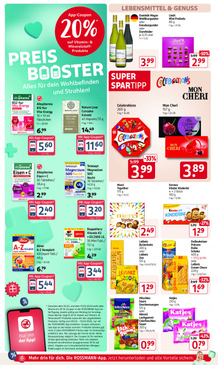 Bitte beachten Sie, dass dieser Text automatisch generiert wird und möglicherweise Fehler enthältLEBENSMITTEL & GENUSS App-Coupon Dominik Meyer it 1e Weißburgunder Pralinés A oder 809 Grauburgunder 1ig=3738 oder Dornfelder je 0,75 Liter LA 112532 auf Vitamin- & 741 RNR Mineralstoff- Produkte Ed Ë za we de Sn 99 Ki SUPER SPARTIPP lesen MON ® CHERI B12 Kur Altapharma Celebrations Mon Cheri Vita-Energy EE B12 Kur Nature Love narune Love‘ Curcuma 269 9 1579 Vita-Energy Extrakt Ikg=14.83 1kg=24.78 10x 10ml Curcuma Fläschchen rer ti 45 Kopseln/35g 11= 69.90 Tig =d N & Lie. passant. 62° 1 449 ® Mit App-Coupon* NT (CEA I; [N Al LES ik [2 : 5 33% Fotesept DA Tetesept EX | © Magni Im Magnesium 99 Eisen +C Altapharma RES el Eisen+C 500 Nacht | 500 Nacht 60 Tobletten/ 30 Tobletten/ 3849 4269 Merci Ferrero 1kg=77.86 no 1k9= 93.66 Together Kinder Kinderini ©) 159 4.x 2 Stück 22 99 1ig=1423 1009 SS 1kg= 1290 Mit App-Coupon* DTE NN r 155 ma Kinder: 2) Er KE merci together, q -21% irc Doppelherz ve Vitamin K2 49 aktiv AIDS +D3 2500 LE. +D; 2500. en 30 Mini-Tabl./ Leibniz DeBeukeloer 1319 Butterkeks Prinzen Abtei 2009 Rolle AZ A-Z Komplett 1ig= 32748 oder Schoko 40 Depot Tobl/ D} Leibniz 42° Zoo ‚Prinzen 4009 EE 469 +50 g gratis Akg= 10761 1259 oder Mit App-Coupon* 1ig=645/1032 ES Leibniz 2 = Ur Cream Choco 67° 2289 fp 1ig=376/741 NT EE X ir 69 TEE Hitschies Katjes Saure 2109 Drachenzungen tg =376 * Zwischen dem 16.02. und dem 15.03.2026 steht Jede Woche ein 20 %-Coupon In der ROSSMANN-App zur hitschies 1259 Verfügung, Jeweils gültig von Montag bis Sonntag. oder Diese Woche: täglich 20 % Rabatt auf Vitamin- & Nimm2 a 7? at) jes | Mineralstoff-Produkte sowle die hier abgebildeten. Pai Lachgumi 1 Produkte. Gültig vom 09.03. - 15.03.2026, nur mit Colañlaschies ‘der ROSSMANN-App elnlösbar. Coupon aktivieren, ÿ ui Sauer und App an der Kasse scannen. Produkte können ggf. L Katjes nicht In allen ROSSMANN-Filllen oder im Onlineshop 2009 erhältlich sein. Nur solange der Vorrat reicht. Keine 11g= 792/435 a it Barauszahlung möglich. Der Coupon it für mehrere a LE) Artikel gleichzeitig eilösbar. Nicht mit anderen pp! Aktionen kombinierbar (ausgenommen 10 % auf ‚Änderungen Im Sortiment vorbehalten. alles) Abgabe nur In haushaltsülichen Mengen. VA EB Mehr drin für dich. Die ROSSMANN-App. Jetzt herunterladen und alle Vorteile sicher