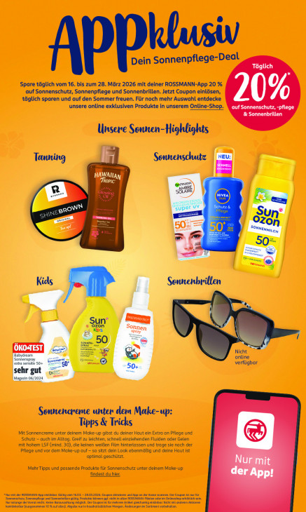 Bitte beachten Sie, dass dieser Text automatisch generiert wird und möglicherweise Fehler enthältklusiv Dein Sonnenpflege-Deal P Spare täglich vom 16. bis zum 28. März 2026 mit deiner ROSSMANN-App 20 % auf Sonnenschutz, Sonnenpflege und Sonnenbrillen. Jetzt Coupon einlôsen, täglich sparen und auf den Sommer freuen. Für noch mehr Auswahl entdecke unsere online exklusiven Produkte in unserem Online-Shop. Unsere Sennen-Highlights Sennenschutz N nr "4 Den Le mer Es 50 BO > en | so Porn rr Sosa Ress) Kids Sennenbrillen ozon \ 2400 = SERA Nicht a online Pa ES „© verfügbar Sennencreme unter dem Make-up: Tipps & Tricks Mit Sonnencreme unter deinem Make-up gibst du deiner Haut ein Extra an Pflege und Schutz - auch im Alltag. Greif zu leichten, schnell einziehenden Fluiden oder Gelen mit hohem LSF (mind. 30), die keinen weißen Film hinterlassen und trage sie nach der Pflege und vor dem Make-up auf - so sitzt dein Look ebenmäßig und deine Haut ist optimal geschützt. Mehr Tipps und passende Produkte für Sonnenschutz unter deinem Make-up findest du hier. “Nur mit der ROSSMANN-App einläsbar. Gülig vom 16.03 - 28.03.2026. Coupon aktivieren und App an der Kasse scannen. Der Coupan ist nur für Somenschutz, Sonnenpflege und Somenbrilen gülig. Produkte können agf. nicht in allen ROSSMANN-Filalen oderim Onlineshop erhältlich sein. Nur solange derVorra richt Keine Borauszahlung möglich. Der Coupon ist für mehrere Artikel gleichzeitig einlösbar Nicht mit anderen Aktionen kombinierbar (ausgenommen 10 % auf ales). Abgabe nur in haushaltsüblichen Mengen. Änderungen im Sortiment vorbehalten.