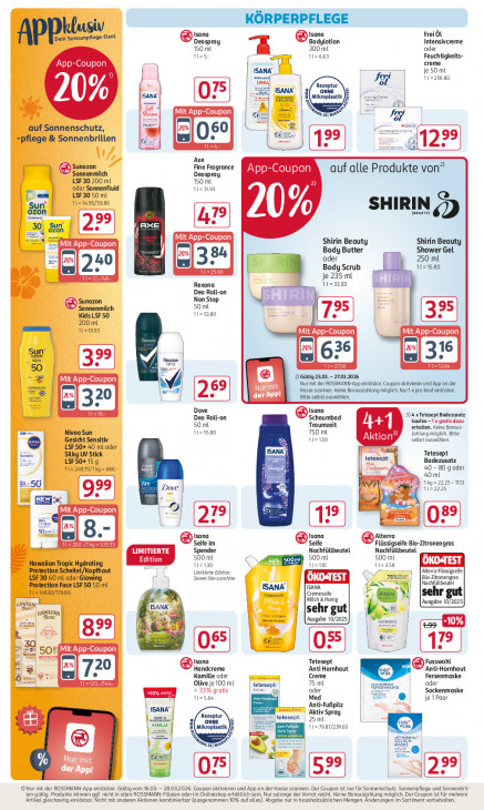 Bitte beachten Sie, dass dieser Text automatisch generiert wird und möglicherweise Fehler enthältKÖRPERPFLEGE Isana Isana Frei ÖL Apple. Deospray Bodylotion Intensivcreme 150 ml EK © 300 ml oder es 112663 Feuchtigkeits- App-Coupon creme 5 je 50 ml | ISANA 112259.80 UREN Rezeptur öl ISANA 20% ISANA' Be WES CE Fe a = ‘ao £ de CIT Ee le "Den En auf Sonnenschutz, -pflege & Sonnenbrillen En le \ Axe Sunozon Sonnenmilch Fine Fragrance App-Coupon auf alle Produkte von” LSF 30 200 ml 150 ml Deospray ‘oder Sonnenfluid 2) 1122193 LSF3050 ml Sun 1 95/5980 SHIRIN òzon PAZ rs Er axe "| | CIT MIT Shirin Beauty Shirin Beauty Body Butter Shower Gel J oder 250 ml 11=15.80 IE Body Scrub EL IE je 235 ml 7e Rexona 112338 Deo Roll-on Sunozon Non Stop ] Sonnenmilch 50 ml Kids LSF 50 112580 200 mL BE 1121995 CE UT ETEN À | su 50 En 2 IE EN NT 2 euwig2203.-2703.2026 | | À TL Nurmit der ROSSMANN-App einlisbat Coupon aktivieren und Appan der le der App! Bitte selbst auswählen. Kasse scannen. Keine Barauszahlung möglich. Nur! xpra Kauf einläshar. Dove Isana En 3) 4 xTetesept Baderusatz [sl Deo Roll-on Schaumbad kaufen -1 x gratis dazu 50 ml Traumzeit erhalten. kene Baraus- Nivea Sun 125580 750 ml Zahlung möglich. Bitte Gesicht Sensitiv 112159 selbst auswählen. | © LSF 50+ 40 mL oder in Silky UV Stick Tetesept LSF50+ 159 pre tetesept Badezusatz 12 24975/ kg = 666- anni end, 40-80 g oder 40 ml en 1ig=2225- 1113 56 Dove 1122225 3 et EE: EE e | INT | BE si Pe y Isana Isana ra in Seife im Seife igseife Bio-Zitronengras UE Spender Nachfüllbeutel Nachfüllbeutel 500 ml 500 mL h Edition 112130 500 ml =10 358 ÖKOSTEST E = Protection Hawaiian Tropic Hudrating aut Limitierte Edition: 2 Altena Flüssigseie| ‘Sweet ike sunshine OKOSTEST eye Bio-Zivonengas LSF 30 60 ml oder Glowing tection Face LSF 50 50 ml ( Sox | Nachfüllbeutel ISANA | EU 149 83/1780 Granssere Cremesaife ÿ senr Hs May ZN, mich Honig (Ausgabe 10/2025) R Tore ISANA' sehr gut Bi sw) er mn Peer ‚Ausgabe 10/2025, as -10% jk + ke 2 50: DOTE Isana Tetesept Fusswohl Handcreme ‚Anti Hornhaut Anti-Hornhaut Kamille oder Creme Fersenmaske 4 Olive je 100 ml tetesapt: 75 ml oder ES oder Se Sockenmaske 1e + 33% gratis su Med je 1 Paar _ Anti-FuBpilz | ISANA” Aktiv Spray Rezeptur tetesep! 25 ml Vime OHNE RS Am En =7987/23960 rss i (Mikroplastik, © par HEN En Dem S si Ê % | [CA 3 1) Nur mit der ROSSMANN-App einlösbar. Gültigvom 16.03. - 28.032026. Coupon aktivieren und App an der Kasse scannen. Der Coupon ist nur für Sonnenschutz, Sonnenpflege und Sonnenbril Artikel gleichzeitig einlösbar. Nicht mit anderen Aktionen kombinierbar (ausgenommen 10% auf alle). Abgabe nur in haushaltsüblichen Mengen. Änderungen Im Sortiment vorbehalten. len gültig, Produkte können ggf. nicht in allen ROSSMANN-Fllalen oder Im Onlineshop erhältlich sein. Nur solange der Vorrat reicht. Keine Barauszahlung möglich. Der Coupon Istfür mehrere