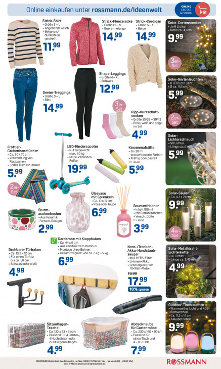 Bitte beachten Sie, dass dieser Text automatisch generiert wird und möglicherweise Fehler enthältONLINE Online einkaufen unter rossmann.de/ldeenwelt nn - Strick-Shirt Strick-Fleecejacke Strick-Cardigan Solar-Gartenstecker Y + GrôBe S-L + GrôBe M-XL + Größe S-XL en hter TN + Angenehm weich « Beere-melange + Beige ot 30 cm «Beige und ee dunkelblau 2 142° 145 99 Sr zE gestreift 1 71; 99 0 —_ mT © Shape-Leggings + Größe M-XL Solar-Gartenleuchten # « Schwarz 5 2 LEDs proLicht CA a 1222 Denim-Treggings 99 + GrôBe S-L «Blau NG D 1422 Ripp-Kurzschaft- socken ECT « GröBe 35/38 — 39/42 + Rosa, weiß und beige PF Ne im Set 439 Solar- Lichterschlauch En) LED-Kinderscooter QE 5 ni Frottier- Kerzenmalstifte Grubenhandtücher + Nutzergewicht v +6x30mI SQ + Ca.50x70cm max. 50 ko wasserbasierte Farben 99 « Verwendung von + Mit leuchtenden + Kräftig oder pastell ivf }, Restgarnen Reifen « Jedes Tuch ein Unikat 1929 599 599 \ we Ir Glasvase Solar- Eu mit Sprenkeln Er cm «Ca. 10x15 cm - Rosa oder taupe x Raumerfrischer 939 Sturm- « Inhalt 100 ml aschenbecher « Mit Rattanstäbchen « Aus Keramik 622 + Versch. Düfte 1124550 ge + Versch. Designs 229 329 7 Garderobe mit Klapphaken «Ca. 44x6cm ‚Aus zertifiziertem Bambus. Nass-/Trocken- Drehbarer Türhaken « Montage ohne Bohren Akku-Handstaub- Solar-Metalldraht- +Ca.13,5x12cm + Gesamttraglast: von ca.2kg-5 kg GL tte + Für einen Türfalz sauger +50 bis ca. ,8cm «Inkl. HEPA-Filter + Län PE + Lidonen-Akku + Schwarz oder weiB 622 + Leistungsstarker 70-Watt-Motor 439 439 + & | 17 99 Ei 12223 fa LA sh Outdoor-Tischleucht: + Warm ht und RGB- Far 14 n AU DRE Sitzauflagen- Abdeckhaube . Tasche für Gartenmöbel 99 «Ca. 120 x 33x 51cm Nd « Ca. 230 x 160 x 90 cm £ 2 » Passend für 4 Polster-, « Passend für 4 Hochlehner-oder einen Tisch und 2 Rollliegenauflagen à 1 4-8Stühle 439 729 ROSSMANH Kostenlose Kundenservice-Hatline: 080076716266 (Mo. Sa. von 8.00 - 20.00 Uhr) oderE-Mall kundenservice@rossmann de