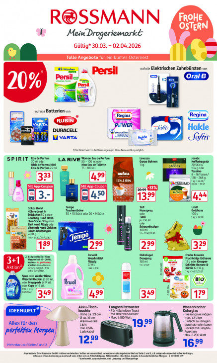 Bitte beachten Sie, dass dieser Text automatisch generiert wird und möglicherweise Fehler enthält_R@SSMAN N FROH STER Mein Drogeriemarkt Gültig* 30.03. - 02.04.2026 Tolle Angebote für ein buntes Osternest auf alle Elektrischen Zahnbürsten von D Seas … Persil Persil Oral B 102 Pro % “| & a aufalle Batterien von ina —— ina 6 regina = Td a | VARTA he CD WER Dd =. Jofig Hakle AT Bea) DURACELL Das srÄRK. En Lat benen e KU VARTA takte © ax Sof = 1) Der Rabatt wird an der Kasse dbgezogen. Keine Barauszchluing mäglich Woman Eau de Parfum Lavazza, SPIRIT Ecuéerorum 30 mL oder LA RIVE 50 - 100 ml oder Ganze Bohnen Ulric de Varens Mini Man Eau de Toilette 1kg 20 Stück, Eau de Parfum 25 ml 75-100ml 104 g oder Tassimo [nt 8-16 Tassen/ | 128-2689 3») CREMA E ARONA 69/ 3469 1697 INTE LEE à lésrassino w 450 Be) Dokas Hund Tempo Taft Lindt Hühnerbrust in Taschentücher 30 x 10 Stück oder 20 x 9 Stück oder Haarspray Goldhase Stückchen 50 g oder „lack 1009 de Goodboy Hund Hähn- 1g= 2290 ‚chen Sticks 90 q oder _- je 250 ml oder Bint Hund Fillets oder Schaumfestiger - Vitakraft Hund Chicken 150 mL Bonas Kaustangen 112119641983 | je80g Tg =37 80/21/2263 | 4° 2 3x Spee/Welder Riese Waschmittel Hidrofugal Freche Freunde Waschmittel 16- 20 WL 150 mL Deospray PE Fruchtchips Erdbeere cu ‘erhalten. Keine Baraus- kaufen -1x gratis dazu 27WL Flüssig 1227 12 g oder Knusper- Schnitte Banane & Aktion Zahlung möglich. Bitte AWL=018 Kürbis 6 x14.g seb auswählen. EE N lar. “al Spee oder WeiBer Riese & Waschmittel Gel je 20 WL LE Mas 5 ‚oder Megaperls je 17 WL Rrwoll ge, AWL=017/ ‚oder Caps je 16 WL bre 02/02 We: ® wo Akku-Tisch- Langschlitztoaster Wasserkocher leuchte Für 4 Scheiben Toast Colorglas | Höhe ca. 23 cm mit Brötchenaufsatz Fassungsvermögen 9 ca.19cm Max. 1.400 Watt max. 1,7 Liter WarmweiBes Einfach zu reinigen Alles für den Licht 929 durch abnehmbaren Inkl. USB- Deckel mit Easyfill- Ladekabel Funktion ‚perfekten Morgen Max. 2.200 Watt 1222 Mehr dazu auf Seite 2 und 3 622 ‘Angebote der Dirk Rossmann Gb. Irtüimervorbehalten Solten einzelne Artikel, Insbesondere die Angebotsartke auf Sete 2 und 3, z8. aufgrund unenwartet hoher Nachfrage, schon am ersten Aktionstag ausverkauft sin, bitten wir um Entschuldigung. Aktionsartikel ohne Dako. Abgabe in haushaltsülichen Mengen. | DE-ÒKO-029 bundesweit, ausgenommen Juist, Langeoog und Wangerooge,