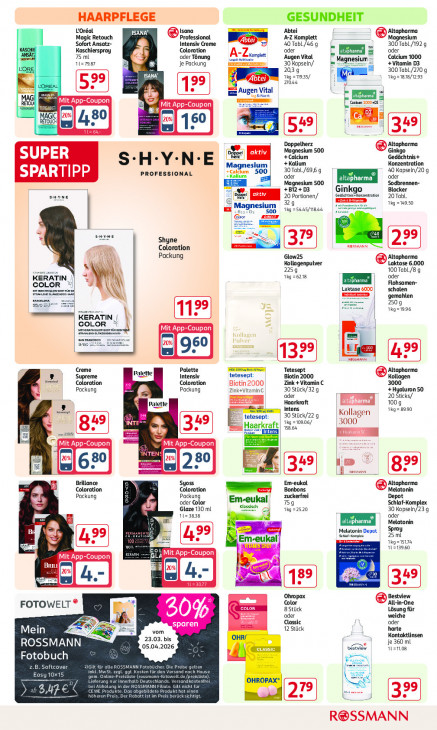 Bitte beachten Sie, dass dieser Text automatisch generiert wird und möglicherweise Fehler enthältHAARPFLEGE GESUNDHEIT L'Oréal ISANA Isana Abtei Altapharma Magic Retouch Professional A-Z Kom; Magnesium Sofort Ansatz- Intensiv Creme 40 Tobl/46 q 300 Tabl./192 9 Kaschierspray Coloration oder B oder 75 ml oder Ténung mb A-Z ‚Augen Vital Calcium 1000 1 7287 2 je Packung 30 Kapseln/ £ Magnesium +Vitamin D3 2039 | 300 Tabl./270 g TA 1kg=n935/ Akg=1818/1293 F 044 gm had tal (5 ugen oet a Mac BE Mit App-Coupon au 2000205 RETOU! AIT TETE a 2; Ca RETOUCH 48 Doppelherz Altapharma SUPER + Calcium Magnesium 500 Ginkgo Gedächtnis+ S:H:Y:N:E , +Kalium Konzentration lagnesium SPARTIPP PROFESSIONAL x En he ium 508 30 Tabl./69,6 g 40 Kopseln/20 9 oder ES oder Magnesium 500 Sodbrennen- +BI2+D3 Ginkgo Blocker Ne Cen 20 Portionen/ Gadachnionzenerstion 20 Tab. 329 1kg = 1950 Eu Magnesium 500 Tg =S 4s/ BAL ei same Pr Shyne er Coloration RSSMANN €) Packung Glow25 Altapharma Kollagenpulver Laktase 6.000 De 2259 100 Tabl./8 9 KERATIN ug =6218 oder È Flohsamen- COLOR ee ae ro Laktase 6000 schalen a gemahlen Er deel 2504 Sn À 1Kg=1996 KERATIN ; COLOR à 8 Be remises TEN ‘sourse mn K gen m sa ve — ET 8 Ten Creme Palette Veen] Palette | Tetesept Altapharma ces Supreme Intensiv tetesept Biotin 2000 Kollagen Coloration Coloration Biotin 2000, Zink + Vitamin € 3000 5 Packung Packung ZinksVitaminC 30 Stück/329 +Hyaluron 50 oder 20 Sticks/ pau Haarkraft 1009 ee Intens 1kg= 8390 tetesept 30 Stück/22 g Kollagen I tg =10906/ 3000 Haarkraft 164 = + OENE KT ÍTEN == 680 Brillance Syoss Em-eukal Altapharma Coloration y Coloration a Bonbons Melatonin Packung 5 Packung zuckerfrei Depot oder Color Em-eukal Schlaf-Kom, dr Glaze 130 ml Klassisch fe el je 759 3838 1kg =2520 oder 30 Kapseln/239 8 Melatonin Bi 1% =, Melatonin Depot Spray RE 3 Safan 25 mi Kgzısıza ue na) 213960 Mit App-Coupon PT eee CT hi Da LA Fa ea ec in ES er Ohropax Bestview FOTOWELT® Color All-in-One ES 8Stück Lösung für oder weiche M 20% Classic oder ai EL 12 Stück harte Mein vom Kontaktlinsen 23.03. bis je 360 ml ROSSMANN 05.04.2026 CT Es 1enos Fotobuch Ze er z TETE Te ES den inkl Kos für den d nach He ee 10x1 a D Ne FA = CET an mr 2 bei Abholung in re D DENTS NN il KE A VEEN hôh ni Der Rabatt ist im Preis berücksichtigt R@SSMANN
