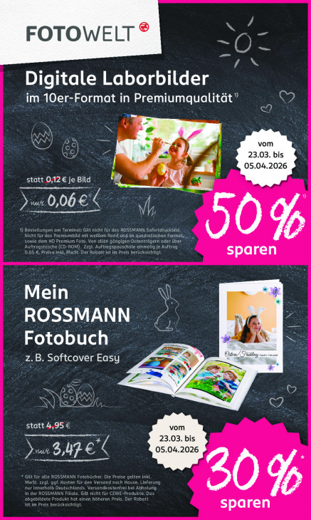 Bitte beachten Sie, dass dieser Text automatisch generiert wird und möglicherweise Fehler enthältNL FOTOWELT © aten IN Digitale Laborbilder im 10er-Format in Premiumqualität” Ca vom SE 23.03. bis 05.04.2026 statt 0,12€ je Bild 3 > Mu, Ô 06 € DEIN SEE LT EN ue tr COL SENTE ET TETE AT] INNEN TCT CTH PEP et 0% EU En A CE Cr Cor eee CRTC Te Auftragstasche (CD-ROM). Zzgl. Auftragspauschale einmalig je Auftrag 0,65 €, Preise inkl, MwSt. Der Rabatt-ist im Preis berücksichtigt. sparen Mein * Rte TUE Fotobuch se a" Ostern, z.B. Softcover Easy ed > # a N ” © D AN e WR CJ Ee ALES vom 23.03. bis € 05.04.2026 TE * Gilt für alle ROSSMANN Fotobücher. Die Preise gelten inkl MwSt. zzgl. ggf. Kosten für den Versand nach Hause. Lieferung nur innerhalb Deutschlands. Versandkostenfrei bei Abholung in der ROSSMANN Filiale. Gilt nicht für CEWE-Produkte. Das ist im Preis berücksichtigt. CT CENT A LN ET ed sparen