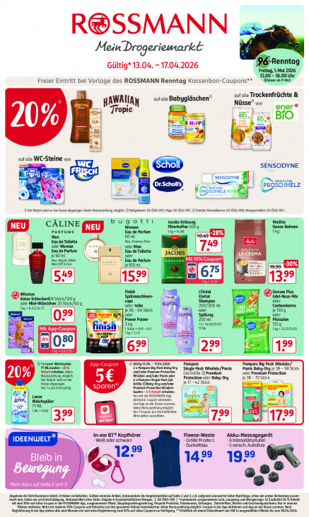 Bitte beachten Sie, dass dieser Text automatisch generiert wird und möglicherweise Fehler enthältR@SSMANN Mein Drogeriemarkt Renntag Gültig* 13.04. - 17.04.2026 Freitag, 1.Mai 2026 12.00 - 18.00 Uhr (Einlass: ab 11 Uhr) Freier Eintritt bei Vorlage des ROSSMANN Renntag Kassenbon-Coupons** auf alle Trockenfrüchte & D aufalle Babygläschen AWAIIA Nüsse? von ener® >) Tropic BO engere ss BIO Si H:FP o % | En rh E Le auf alle WC-Steine von maa SENSODYNE ed - u & Ei ar % SENSODYNE m = I ax PROSCH E he ze) 1x € =, 1) Der Robatt wird an der Kasse dbgezogen. Keine Barauszchlung möglich. 2) Babydream: DE-OKG-001; Hip: DE-ÜKO-001.3) Enerbla Mandelkerne: DE-ÖKO-D08; Mangastrifen DE-ÖKO-0D1. bugatti ‚Jacobs Krönung Melitta CALINE Woman Filterkaffee 500 q Ganze Bohnen PARFUMS Eau de Parfum ik -28%| 1kg Man 60 mL «nc | Î Eau de Toilette eu Essen dre a ae | oder Woman oder Man 49 Eau de Parfum Eau de Toilette ES je 60 ml oder ir eu: M de Wte est Eau de Parfum ROET 60m! Je100 ml 30% a 99 Ik Finish L'Oréal ‚Genuss Plus. Winston Elvital Katze Schleckerli 8 Stück/120 Spülmaschinen- Gus Edel-Nuss-Mix ‚oder Mini-Würstchen 20 Stück/40 9 caps ELVITA Sham oder 119 =825/2475 oder -tabs 200/300 mL (UE Cashewkerne je 36 - 64 Stück oder nu mix je150g = = 7. 7 oder ELVITA oder EEE | Power Putver a 250 ml TA Pistozien 3kg 1121495/997/ 1 1259 pe TER ist 19-0n 11.96 ÉD 1 Na=1azıns82 ik OU “= Vl Er ir? am 5) 1x enor Welchapülar Aj 6) Gültig 13.04. - 17.04.2026 Pampers Pampers Big Pack Windeln/ TIWL kaufen - 20% Upon 2x Pampers Big Pack Baby-Dry Single Pack Windeln/Pants Pants Baby-Dry je 38 - 98 Stück Rabatterhalten. Keine und /oder Premium Protection (ab Größe 3) Premium oder Premium Protection Barauszchlung möglich Windeln und/oder Pants oder Der Rabatt wirdander 5€ 4xPampers Single Pack (ab Protection oder Baby-Dry je 38-70 Stück Kasse abgezogen. (Größe 3) Boby-Dry und/oder je 17-42 Stück Nur 1x pro Koufgültg sparen‘, Premium Protection Windeln. Ge kaufen -5 € Rabatt erhalten Lenor Nur mit der ROSSMANN-App denon, Weichspüler nläsbar. Caupon aktieren ae => TIWL Keine Barauszahlung möglich und App an der Kasse scannen. ri a, 1L< 006 Aur Coupon pra Kauf einlösber. reg TT Be selbst auswählen. eef PLUS 1799) In-ear BT® Kopfhörer Fleece-Weste Akku-Massagegerät CETTE dd Weiß oder schwarz Größe ModerL 6 Intensitätsstufen Dunkelblau 5 versch. Aufsötze Bleib in 6 1222 1429 929 122777777 Mehr dazuauf Seite 2 und 3 ‘Angebote der DirkRossmann GmbH. rrtümervorbehalte. Sollten einzelne Artkl, Insbesondere die Angebotsartjkel auf Sefte 2 und 3,2.B. aufgrund unerwartet hoher Nochfrage, schon am ersten Aktionstag ausver- kauft sein, bitten wir um Entschuldigung. AktionsartikeL ohne Deko. Abgabe in hausbaltsübichen Mengen. | DE-ÖKO-039 | *bundesweit, ausgenommen Als, Langeoog und Wangerooge. 4) Zusätzlich 10 % Rabatt mit dem 10%-auf-alles-Coupon in der ROSSMANN-App, ausgenommen Pfand, Säuglingsonfangsnahrung, Prepald-Produkte, Tabakwaren, Zeitungen, Zeitschriften, Bücher und Geschenkgutscheine. Nur In unseren Registrierung in der App stehen ale zwei Monate vier und ohne Registrierung zwel 10%-auf-alles-Couponszur Verfügung.“ Erhältlich ab einem Einkaufswert von 10€ In ausgewählten Alien bis zum 30042026. Fiilen einlösbar. Nicht mit anderen 10%-Coupons und Robatten auf den gesamten Einkauf kambinlerba. Keine Barauszahlung möglich. Coupon in der App aktivieren und App an der Kasse scannen. Nach