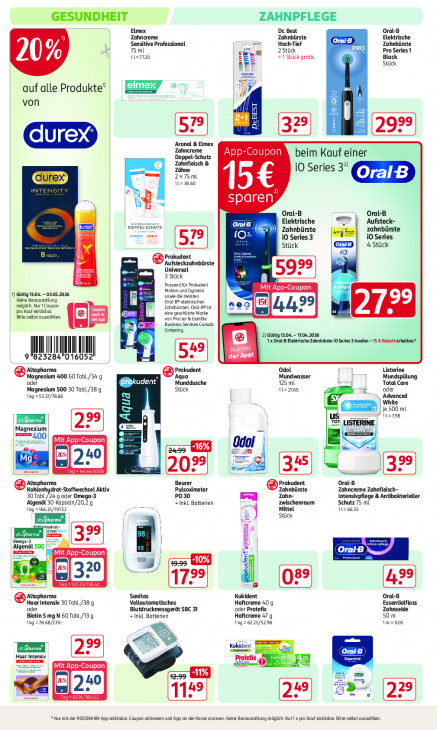 Bitte beachten Sie, dass dieser Text automatisch generiert wird und möglicherweise Fehler enthältGESUNDHEIT ZAHNPFLEGE Elmex Dr. Best Oral-B Zahncreme Zahnbürste Ca Elektrische Sensitive Professional Hoch-Tief Zahnbürste 75 ml el 2 Stück PRO Pro Series 1 1127720 E +1 Stück gratis Black ie a Stück a auf alle Produkte? [elmex 4 as ES FE HE ijz von @ ) durex Aronal & Elmex Zahncreme App-Coupon beim Kauf einer Zahnfleisch & Doppel-Schutz Zähne 2x75 ml iO Series 3” fore IB 1123860 15€ sparen = og _ Oral-B Oral-B Elektrische Aufst pè Ht CE) U Zahnbürste zahnl rste B ms « er i0 Series 3 iO Series Stück 4 Stück iO Prokudent Aufsteckzahnbürste Universal 3 Stück De Passend für Prokudent mer Mation und Dynamic INKT 1 cai 30402052026 sowie die meisten Keine Borauszahlung Oral-B» elektrischen möglich. Nur! aupen Zehrbürsten. Oral-BP ist „eo pro kauf enläsbar. ri ca Sm eine geschützte Marke Bitte selbst auswählen. EL van Procter & Gamble { Business Services Canada Company. 2) Gültig 104. 7.04.2026 1x Oral-B Elektrische Zahnbürste 10 Series 3 kaufen -15 € Rabatt erhlten.* III] III] NT | 823284 | 5 | 1 der App! Prokudent Odol Listerine ® Altapharma Magnesium 400 60 Tabl./54 9. Aqua Mundwasser Mundspülung oder Te rt Munddusche 125 ml Total Care Magnesium 500 30 Tobl./38 9 Stück 1122760 oder Iig =55-/7868 Advanced White © je 500 ml us; 112798 arme Jel Ter uy NE, Magnesium et | 2» /,00 CITE © 129 Odol 99 D Ed wie 39 Altapharma Beurer Prokudent Oral-B Kohlenhydrat-Stoffwechsel Aktiv. Pulsoximeter Zahnbürste Zahncreme Zahnfleisch- 30 Tobl./24 9 oder Omega-3 PO30 Zohn- Intensivpflege & Antibakterieller « Inkl. Batterien zwischenraum Schutz 75 ml Algenël 30 Kapseln/20,2 g Mittel 112665 tg 6.25/19752 Stück nu det. sel Zum Omen ij 5 Algenöl 500 = OralB LE [8 49-99 -10% à | \ ss) = 2 re: mn 1729 — @ Altapharma Sanitas Kukident Oral-B Haar Intensiv 30 Tobl./38 9 Vollautomatisches Haftcreme 40 g Essentialfloss oder Blutdruckmessgerät SBC 31 oder Protefix Zahnseide Biotin 5 mg N 60 Tabl./13 g Haftcreme 47 g 50 m 1kg =78.68/230- «Inkl. Batterien 1ig=6225/5298 Im=005 => pr Kükident m ES 2%) 5 OralB) Haar Intensiv. tefix re ET CLS a, Au 4 B cr D 5 * Nur mit der ROSSMANN-App einläshar. Caupon aktivieren und App an der Kasse scannen. Keine Barauszchlung möglich. Nur! x pra Kauf einläshar. Bitte selbst auswählen