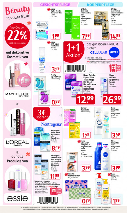 Bitte beachten Sie, dass dieser Text automatisch generiert wird und möglicherweise Fehler enthältGESICHTSPFLEGE KORPERPFLEGE Isana Weleda L'Oréal Hydro Booster Skin Food Age Perfect Bert) 2h Creme-Gel LEE) Intensivpflege LOR Zell-Renaissance 50 ml oder res en Tagespflege 1123980 Light RFEC REE 50 ml n voller Blüte tan Feuchtigkeits- en oder Pr pflege Serum % RES dna = sân Food je75 ml 1121065 == REAL 30 ml 100%. ont 11229880/499.67 App-Coupon EE ISANA”, EN 5 EN Se 22% co Isana täglich ein sbar 120h Liquid Moisturizer das günstigere Produkt 100 ml 112390 gratis auf dekorative CELLULAR Kosmetik von 2) Gültig 1.04. - 1.04.2026 2 xNiven Cellular Produkt kaufen - das günstigere davon gratis erhalten. Keine Barauszchlung möglich Nur! Coupon ISANX pra Kouf ilésbar. Bite selbst auswählen Coupon 4 Pre veren IN EL Il 232 MM u á hj Yeauty rs CHE Nivea Cellular Nivea TT Eye Pad Mask 3x Expert Filler Cellular CL TAnwendung = Tagespflege Epigenetics LSF30 oder Ere © Serum | 1 re Hochwirksame 30 ml Lo 11289967 vesten Anti-Age Ke non: Ln CELLULAR Nachtpflege je 50 ml MAYBELLINE 11225980 NEW YORK æ Garnier Dove ñ passes Tuchmaske Body Milk 1Anwendung Doe oder Body Lotion = je 400 ml Br En 11287 VE # = T x I Keke Zet Pe Neutrogena are) WES 1 on: [# a i Neutrogena 1% , en Hydro Boost da | u Nachtcreme Ke oder Pu | Aqua Creme je 50 ml Isana Nivea L'ORÉAL = 11216980 Lash Color Body Milk PARIS Pr Wimpern- & oder Br ‚Augenbrauen- Body Lotion farbe je 400 ml Braun 112998 ISANA | oder x Schwarz auf alle Sonnenschutz- Neutrogena vaer En je 1 Anwendung à fluid Feuchtig- FARBE ores Produkte von um keitsspendend sec ien LSF 50 oder Sans ETRA Oil Control SHEER LSF 50+ bs je 50 ml Ee e 1122980 Ee Zu 5 Alouette Isana Kosmetiktücher 90/150 Stück 300 ml Bodylotion | | = m) 3) Gültig 12.04. 17.04.2026 Neutrogena Gesihtspflege- und/oder DYNO | MA Te Sonnenschutz-Produkte im Gesamtwert van mind. 10 € kaufen -3 € Rabatt erhalten ee = m Keine Barauszchlung, ” yon möglich. Nur Coupon Coupon | € pro Kaufeinläshar. Fe Bitte sebst auswählen. 2) À = mr Es essle | INN | IN) | Ke 823200 403003 1) Der App Caupan gi vam 13.04. 19.04.2026 und st täglich einläsbar Nur mit der ROSSMANN-App. Ausschließlich auf Produkte aus unseren Kasmetiktheken und unserem Kosmetik Zubehör Produkte können ggf nicht in allen ROSSMANN-Flalen oder im Onlineshop erhältlich sein. Keine Barauszahlung möglich.