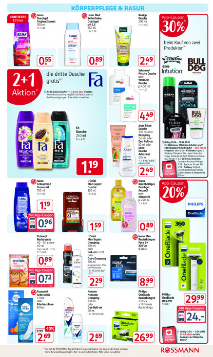 Bitte beachten Sie, dass dieser Text automatisch generiert wird und möglicherweise Fehler enthältKÖRPERPFLEGE & RASUR LIMITIERTE Isana Isana Med Kneipp Duschgel Seifenfreies Dusche App-Coupon Edition Tropical Sunset Duschgel 200 ml 5 300 mL pH5,5 ALES 1l=183 250 ml | 112356 30 % Í / ISANA° } 4 Fr MED DA, 4 Te D Elina beim Kauf von zwei QE ae Aie Produkten” | | wii SON DER, BULL l Sebamed D marmer Frische Dusche Intuition die dritte Dusche oder Wellness (f gratis” Saône Dusche Ya a je400ml | I= Cet) 4) 2x Fa Dusche kaufen —1 x gratis dazu erhalten. 2 Aktion” Keine Borauszchlung möglich Der Rabatt wird an B der Kasse abgezogen. Bitte selbst auswählen stan — a Fr Ik | ë ach & CES Er I Jean &Len 5 Dusche = Dusche Jelen 250 ml oder = a a Dr À 250 ml sé Deospray 150 ml oder E E ©) 112476 TV | Deo Roll-on 5) Gültig 1.04. - 1.04.2026. kel 50 mL oder 2 x Wilkinson, Wilkinson intuition und/ Fa Dove oder Bulldog Produktkaufen — 30 % Rabatt RELAXIN A MEN Dore | Dusche erhalten? Gt nur aufWilkinsom Hydro 5 5 Advanced Rasirer/Hingen 4 tk, Sword Precison en Aka 225 ml Styler Rasiergel 200 ml, Wilkinsan 6 Rasie- 7 5 rer/kingen 4 tie Wilkinson Intuition: nd 1129.96/1660/ Complete Raserer/Kingen 4980/1107 3Stk, Eyebraw Shaper KL. a 5 sic Bulldog Original tr Feuchtigeitscreme 100 ml, CLOS Dusche Lemon & Bergamatte 300 ml Isana L'Oréal sana Schaumbad Men Expert Reichhaltiges CRE Traumzeit Dusche Duschgel 750 ml 250 ml % Arganël EN 112199 112636 ih NA oder MENEXPERT LOREAL Mandell ID à je 250 ml 112356 PHILIPS ä a . a: VTT el “ pe * FE EE 2 Tu Tetesept L'Oréal sana Men Badezusatz Men Expert Rasierklingen a Pace 6+ 40 mL 40-809 oder 150 mL Deospray 3DFlex Re 1ig=2225 113 oder 8 Stück en 2% Roll-on 50 ml oder Dove Deospray tete: sept: Die 150 mL ISANA es = Tecvesdis aan orginal und Advanced ausgenommen Zink ©} Mit App- Coupon 1527 1121527/4580/ zor FT u er 119 à Test Fusswohl Rexona Philips, Ledersohle Nonstop Oneblade Philips 1Paar OneBlade Deospray Rasierklingen Rasierer G oder 150 mL 3 Stück Frischesohlen oder +1 Intimate Stück en 8 Poor Deo Roll-on Rosierklinge DE A Le 50 ml 1t= 1793/5280 Los Jz m SOHLEN, 24 10% 7 A à 6) Gütig 13.04. 17.04 2026 f- 20 % Rabatt auf alle Fr Tr Rasierer von Philips One 25 der Appt Blade” # Nur mit der ROSSMANN-App enläsbar Coupon aktivieren und App an der Kasse scannen. Keine Barauszchlung möglich. Nur x pra Kaufeinlösbar. ite selbst auswählen. R@SSMANN
