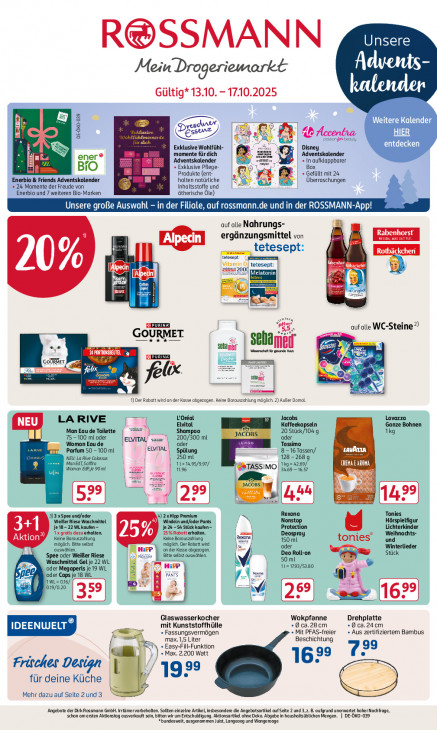 Bitte beachten Sie, dass dieser Text automatisch generiert wird und möglicherweise Fehler enthältUnsere R@SSMANN Advents- Mein Drogeriemarkt Gültig* 13.10. - 17.10.2025 & Weitere Kalender 8 lid DE-6KO-039 @® Accentra HIER C7 forbear, Exklusive Wol Disney Et CU LD momente für dich Er B ‚Adventskalender ener® ‚Adventskalender 2 + in aufklappbarer » Exklusive Pflege- rés Box BIO Produkte (ent- + Gefüllt mit 24 Enerbio & Friends Adventskalender halten natürliche Überraschungen 24 Momente der Freude von Inhaltsstoffe und 8 8 Enerbio und 7 weiteren Bio-Marken ätherische Öle) Unsere große Auswahl - in der Filiale, auf rossmann.de und in der ROSSMANN-App! auf alle Nahrungs- LE D} ergänzungsmittel von tetesept: tetesept | BEE DI tetesept: Dar % OO Ge us ; Re = ENV aufalle WC-Steine ? GOURMET 2 En + Pt a seha Setaner Mara rude au mer ETES Las = coïf ge ASF fel zen, 5 EN 1) Der Rabat wird an der Kasse abgezogen. Keine Borauszahlung möglich. 2) Auer Domal. LA RIVE ] L'Oréal Jacobs Lavazza Ex Elvital Kaffeekapseln Ganze Bohnen Man Eau de Toilette Shampoo 20 Stück/104 9 kg 75-100 ml oder 200/300 m oder Woman Eau de | ELVITAL! sax | oder Tassimo Parfum 50 —100 ml [euvrraL 8-16 Tassen/ CU AMEL: La Five Cobssus 250 mL 128-2689 Man Ed Saffra ce | 112 14.95/997/ 69/ CREMA E ROMA Woman Ed je 90m 11.96 \®&TAssımo Li: 1657 En al 2 (5 99 bh 22 . “4 & En 33 xSpee und/oder 4) 2xHipp Premium Rexona Tonies Weißer Riese Waschmittel Windeln und/oder Pants Nonstop Hörspielfigur Kh je 18-22 WL kaufen je 24 — 54 Stick kaufen 25 % Rabat erhalten. Protection Lichterkinder Aktion”, 1x grats dazu erhalten. Keine Barauszahlung Kene Barauszchlung | Deospray tonies Weihnachts- möglich Be selbst möglich. Der Rabatt wird 150 mL und auswählen. ‘onder Kasse abgezogen. oder Winterlieder Spee oder Weißer Riese ri Bitte selbst auswählen. Deo Roll-on Stück Waschmittel Gel je 22 WL w 50 mL oder Megaperls je 19 WL HEP | 1121783/5380 oder Caps ms | \- Av. 016/ Ve (018/020 A | ie Glaswasserkocher Wokpfanne Drehplatte mit Kunststoffhülle “0 ca. 28cm 0 ca. 24cm « Fassungsvermögen « Mit PFAS-freier « Aus zertifiziertem Bambus. max.1,5 Liter Beschichtung Easy-Fill-Funktion Max. 2.200 Watt 729 16°° Frisches Desü y 193° für deine Küche Mehr dazu auf Seite 2und 3 eg ‘Angebote der DirkRossmann GmbH. rrtümervorbehalte. Sollten einzelne Artikel, Insbesondere die Angebotsartikel aufSete 2 und 3,2. B. aufgrund unerwartet hoherNachfrage, schon am ersten Aktionstag ausverkauft sin, bitten wir um Entschuldigung. Aktionsartkel ohne Deko. Abgabe in haushaltsälichen Mengen. | DE-OKO-039 *bundeswe, ausgenommen Juist, Langeoog und Wangerooge