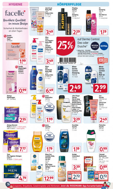 Bitte beachten Sie, dass dieser Text automatisch generiert wird und möglicherweise Fehler enthältHYGIENE KORPERPFLEGE er 2 Jean & Len Playboy Fa Body Milk Dusche Deospray oder 250 ml 150 mL she: Body Lotion oder oder facelle Me je 250 ml Deospray Deo Roll-on Dn u 1121396 150 mL 50 ml 12916/1527 11=8.60/3580 Bewährte Qualität no] im neuen Design = De Sicherheit & Wohlbefinden ee = À] an allen Tagen Facelle es Tampons Mixa Urea Super 56 Stück auf Derma Control Cica Repair+ 7” Body Milk Deo oder oder Intensiv Dusche” facell \ Straffend Tampons Body Lotion so Et [je 250 ml 1) Güitig 13:0. 17102025 super sa 136 2x Neg/Nivea Men Derma Control Deo SRE " lens und/oder Dusche kaufen -25% Rabatt erhalten Keine Borauszahlung möglich. Nur Coupon pro Kauf nz Pme inläsbar. Bite selbst auswählen 2 Be Coupon auhin mo UL Facelle Nivea Nivea Nivea Slipeinlagen 10 Derma Derma Comfort Straffende Pockets Body Milk Control Control 30 Stück ee oder MEN MA. Deospray Deo facell AN Body Lotion 150 ml Roll-on Stipeinlagen \ je 400 ml Er 1121660 50 ml comfor 1121623 pockets, 112 59.80 sas )1C a1 - none) Isana Axe Always John Player lagen Bodylotion Special Dusche 6 Stück 5 300 ml Hair & Body 250/225 ml ‚Shampoo oder oder … Bettina Barty Axı Jean &Len ER p= Rezeptur Bath & Shower Dusche Berta Eng Gel oder BAG 250 ml us ik Hand & Body 112996/11.07/ EN LS Fe sono Lotion oder Et 9.26 UREA | V ULLA Rich Body Milk EE ODD | = De je 500 ml 2658 M hd & | a Nes ÿ = E ms ® Always Discreet sana Duschdas Palmolive Pants 10 Stück + 1 Stück gratis Duschöl Dusche Dusche oder 9 Stück + 1 Stück gratis 250 ml 225 ml 250 ml ue 112618 112396 Rezeptur en E A OHNE ei i Ikroplasti E Ce en oem 77 ER ways | | 77 Be Tena Nivea Sun Kneipp Tetesept Men Hygiene-Einlagen Invisible Daily Schaumbad Badezusatz Level 2 UV Fluid 400 ml 40-80 g oder 10 Stück + 2 Stück gratis LSF50+ EL teteseı 40 ml 40 mL De 1h92 2225-1118 er a oder a 225 2in1 Primer rm Dai UV Serum En LSF 50+ 30 ml totosep! wer Bu TETE TL ET Mit App-Coupon En ze al 272) 9:/11=18 upons, Angebote, Gewinnspiele und Aktionen. Jetzt die ROSSMANN-App herunterladen! FL