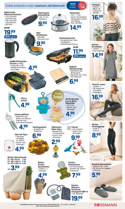 Bitte beachten Sie, dass dieser Text automatisch generiert wird und möglicherweise Fehler enthältONLINE Cardigan Online einkaufen unter rossmann.de/ldeenwelt »GrößeS-L + Beige mit schwarzen Elektrischer Streifen em Milchaufschäumer Elektrischer Eierkocher « ILAG-Antihaft- Dosenöffner « Für1-7 Eier «Inkl. 2x AA- « Kocht verschiedene x beschichtung Batterien - = \ Härtegrade in einem 16? 2 1} « Kalt und warm en \ Durchgang aufschäumen + Max. 420 Watt d «500 Watt 3» m à ‚142° \ m Mini- vi sl N 193° Waffeleisen «550 Watt DEN KL Sandwichtoaster 71 + Mint oder rosa + Extragroße und -tiefe Toastplatten « Antihaftbeschichtung CE Damen- Strickkleid + GrôBeS -L + Grau-melange > 19 20% sparen 142° Heißluftfritteusen- A Einsatz 2-teilig + Eckig oder rund « Wiederverwendbar Digitale «Aus Silikon 42 Küchenwaage «Oberfläche aus Bambusholz DL + Kapazität max. 10 kg Inkl. Batterien er 99 Ër Fr \ 5 Thermo-Jeans »GrößeS-L « Mitangerauter À Ru Innenseite + Dunkelgrau Mega Zitrus- Trend | Fluffy Monster presse I Luv-A-Boos Plüschtier ‚16 + Ca.15cm 42 + Versch. Aus- € @ führungen | = > Universalöffner 3 \ + Erleichtert das As 499 Öffnen von Gläsern, N N Flaschen und Ei \ Schraubverschlüssen Damen- Herbstgesteck Halloween- Tierset Formleggings 439 + Geeignet für Solar-Figur + Inkl. Zubehör + GrößeS-L Maxilichte + Bewegt sich « Versch. Aus- «Schwarz im Sonnenlicht führungen Glas mit Figur «Versch. Aus- « Fassungs- 622 führungen 829 vermögen 92 = a ca. 400 ml + Versch. Aus- führungen 2e a 42 € 2) E ee Winter-Schutzhaube Ca.100x80cm 3.99 Ca.180x120cm 5.99 Ca. 240x 200 cm 6.99 Winter- Garten- Garten- Knieschoner Kuschel-Hausschuhe a handschuhe + Für komfortables « GröBe 32/38 — 41/42 «GröBeS-L Arbeiten auf hartem « Mit Antirutsch-Noppen « Gefüttert Untergrund „Anthrazit „399 52 439 72° | Sanitas Oberarm- blutdruck- MA messgerät SBM 41 «Inkl. Batterien = & 192° ROSSMARN Kostenlose Kundenservice-Hotline: 0800/7677626 (Mo. - Sa. von 8.00 -20.00 Uhr) oderE-Mall kundenservice@rossmann de R@SSMANN