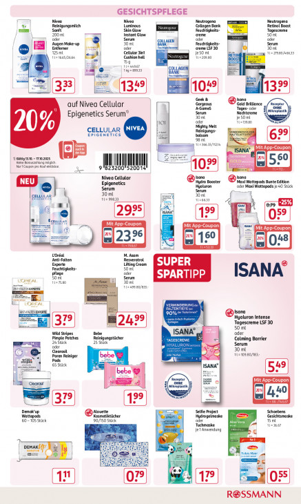 Bitte beachten Sie, dass dieser Text automatisch generiert wird und möglicherweise Fehler enthältGESICHTSPFLEGE Nivea Nivea - Neutrogena Neutrogena © Reinigungsmilch Luminous Collagen Bank Retinol Boost Sanft Skin Glow . Feuchtigkeits- Tagescreme ee 200 ml Instant Glow creme 50 ml oder Serum oder D oder ‚Augen Make-up 30 ml ge Feuchtigkeits- Serum 3a Entferner E33 oder ire creme LSF 30 30 ml © 125 ml Cellular 3in1 je50 ml En .g 11=271980/16633 vr ar \ eel Cushion hell ner 112209.80 RETIM 159 11244967 = re 1kg= 89933 > gien Lr ro = l'E = Fr: E13? Geek & Isana Gold Brilliance Rezeptur auf Nivea Cellular A-Games Gorgeous OHNE Serum Tages- oder Nachtcreme Ikroplast! JE Epigenetics Serum” 30 ml je 50 ml Hol oder 11213980 ee Mighty Melt CELLULAR nigungs- EPIGENETICS balsam 98 mL je a 3662/1214 | N Mit App-Coupon gesae, B Kee Barauszahlung mäglich Re: Nur1 Coupon pra Kauf einlösbar. IN II Il | se 1 23201 I 520014 IE Nivea Cellular sana sana Hydro Booster Maxi Wattepads Bunte Edition Epigenetics Hyaluron oder Maxi Wattepads je 40 Stück Serum Serum vn CELLULAR 30 ml 30 ml Í U 5 Lt 11299833 = 633 or -25% 7] 4 pn h “ ISANK x FA 59 = Besuuular ee ER DEN Es Mit App-Coupon SA TTVN = 4 on EL L'Oréal M. Asam Anti-Falten Resveratrol Experte Lifting Cream SUPER Feuchtigkeits- 50 ml pflege oder ISANA’ 50 ml Serum SPARTIPP rem LOREAI 1127580 tel 30 ml TAU NOPERTE 112499 80/83. = cA L'ORÉAL RT TE U Ne 4 FALTENTIEFE bei EINE ERTE, 90% oen Isana RE (te) Hyaluron Intense Tagescreme LSF 30 50 ml Wild Stripes Bebe ISANA® oder Pimple Patches Reinigungstücher 3d 24 Stück 25 Stück LUC Calming Barrier oder Serum = Clearasil me a 30 ml a ad © Poren Reini Es 11=109.80/183. bebe | Pads 65 Stück ISANA* W ne \® A bebe 9 Rezeptur ung en CEE Ciearasır E 55 CR PE name % nd Ws Demak’up ‚Alouette Selfie Project Schaebens Wattepads Kosmetiktücher Se Hydrogelmaske Gesichtsmaske 60 - 105 Stück 90/150 Stück oder Aloe Vera 15 mL Tuchmaske 1123667 je T Anwendung | kil N 12 al DEMAK NAS ZWN ze il 1 vi 10 K Totes Meer m ra © MT In Ne zel! SANS zu R fs AD R@SSMANN