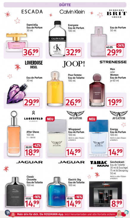 Bitte beachten Sie, dass dieser Text automatisch generiert wird und möglicherweise Fehler enthältDÜFTE BURBERRY ESCADA Calvin Klein % + AT BRIT Especially Everyone Eau de Parfum Eau de Parfum Eau de Parfum 30 ml 100 ml 50 ml [al me | Fr CALVIN KLEIN ESCADA À == 34% EVE Kk os mu 99 LOVERDOSE STRENESSE DIESEL JO OP! Men oder Pour Femme Woman Eau de Parfum Eau de Toilette Eau de Parfum 30 ml Æ : 100 ml je 60 ml À ks 199 199 ( SE LAGERFELD AVIATOR CLASSIC | EI | AVIATOR 3 Wingspeed Energy After Shave ee Eau de Parfum = 5 — Eau de Parfum 100 ml 100 ml 100 ml 112 189.90 Nicht in allen Filialen Nicht in allen Filialen erhältlich. erhältlich. | 7 SE AVIATOR AVIATOR. 3255 Wd en 1829 ms = JAGUAR JAGUAR Geschenkset: TAB mar Eau de Toilette 30 ml & Duschgel %* 75 ml & Deospray 50 ml N, Nicht in allen Filialen Classic À x erhältlich. Chromite Electric Sky Eau de Toilette Eau de Toilette TABAC 100 ml 100 ml Br Dre 1 % Jetzt herunterladen und alle Vorteile sichern. & EB Mehr drin für dich. Die ROSSMANN-App.