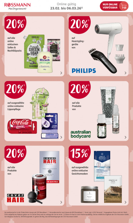 Bitte beachten Sie, dass dieser Text automatisch generiert wird und möglicherweise Fehler enthältR@SSMANN Online gültig NUR ONLINE VERFÜGBAR Mein Drogeriemarkt 23.02. bis 06.03.26” mu = ES CC auf alle 0) auf online 20 Haarstyling- exklusiven He „A geräte Seifen & von GREEN av y Nachfüllpacks taan V4 te IL LU Hirsch WET a zon PHILIPS N A À auf alle Le auf ausgewählte online exklusive Produkte von Lippenpflege : ; Ee u = T' sus australian El bodycare co HAIR TREU AE auf alle auf ausgewählte vou rune MIN Produkte online exklusive Heu 1 IDE MASKE von Gesichtsmasken TETE Pumpsprey zen a He a vr | HAIR Versandkostenfreiin die Fol efernlassen ab 20€ Bestellwert | Versandkostenfrei nach Hause ab 69€ Bestellwert | Sonstz2gL 4.95 Versand | Angegebene Preise sind in. MuSt. Die aufgeführten Rabatte gelten nur in Online-Shop und nur solange der Vorrat reicht. | 2)Dieser Artikel ist nicht filialversandfähig. Online erhältliche Angebote der Dirk Rossmann GmbH, Isernhägener Straße 16, 30938 Burgwedel. Es gelten die Allg. Geschöftsbedingungen der Dirk Rossmann GmbH.