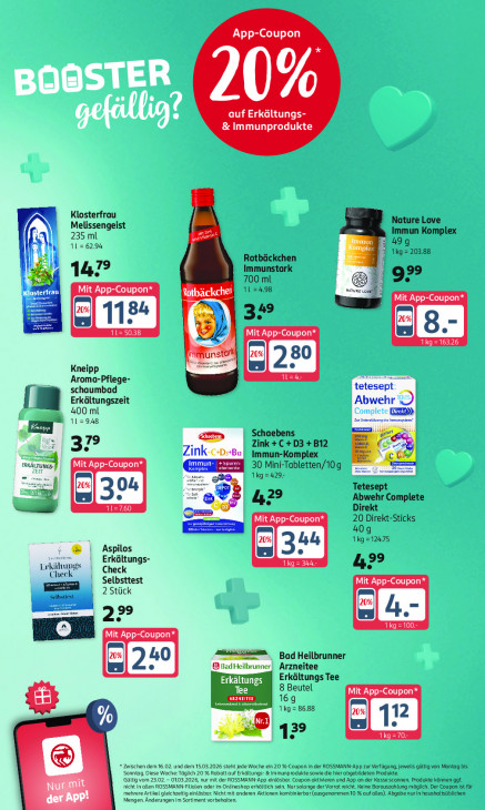 Bitte beachten Sie, dass dieser Text automatisch generiert wird und möglicherweise Fehler enthältApp-Coupon * 20% 0 auf Erkältungs- & Immunprodukte Klosterfrau Nature Love Melissengeist 235 ml Immun Komplex 11 = 62.94 LOT ompí 49g Rotbäckchen 1kg = 203.88 $ Fa 147° Immunstark 99 ne 700 ml Mit App-Coupon* Kuis Rev 11=4.98 Dt Mit App-Coupon* A N) 33 Al Mit App-Coupon* 3.2 an Kneipp = Aroma-Pflege- schaumbad SET Erkältungszeit Abwehr I mn 400 ml EED) d t = 3 79 En Schaebens e Zink +C+D3 +B12 N Zink-c:0»B. Immun-Komplex diane Mit App-Coupon* mun. he m 30 Mini-Tabletten/10g - 1kg =429- Tetesept 42 Abwehr Complete IG 0 Direkt Mit App-Coupon* 20 Direkt-Sticks 40g 1kg =124.75 Aspilos 99 un Erkältungs- LE 344. Che Check Selbsttest Mit p-Coupon* 2 Stück en 22 Selbsttest 100 Mit App-Coupon* 40 Bad Heilbrunner Bad Heilbrunner | Arzneitee Erkältungs Tee Erkältungs 8 Beutel AT Tee Mit App-Coupon* es 16g 1kg = 86.88 % … 28 43 LLC) Cl » Zwischen dem 16.02. und dem 15.03.2026 steht Jede Woche ein 20 %-Coupon In der ROSSMANN-App zur Verfügung, Jeweils gültig von Montag bis Sonntag. Diese Woche: Täglich 20 % Rabattauf Erkältungs- &Immunprodukte sowledie hier abgebildeten Produkte Gültig vom 23.02. - 0103.2026, nur mit der ROSSMANN-App einlösbar. Coupon aktivieren und App an der Kassescannen. Produkte können ggf. nicht In allen ROSSMANN-Filolen oder m Onlineshop erhältlich sein. Nursolange der Vorrat reicht. Keine Barauszahlung möglich. Der Coupon Ist für mehrere Artikel gleichzeitig enlösbar. Nichtmit anderen Aktionen kombinierbar (ausgenommen10 % aufalles). Abgabe nurIn haushlisüblichen CC Mengen. Anderngen im Sortiment vorbehalten.