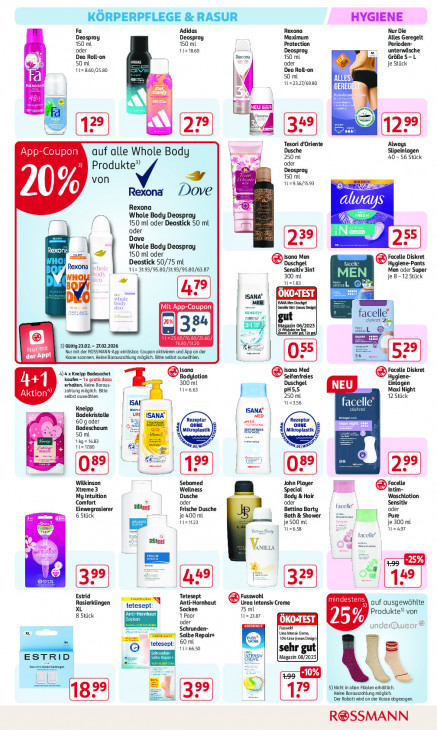 Bitte beachten Sie, dass dieser Text automatisch generiert wird und möglicherweise Fehler enthältKÖRPERPFLEGE & RASUR HYGIENE Fa Adidas Rexona Nur Die Deospray Deospray Maximum Alles Geregelt 150 mL 150 mL Protection Perioden- oder 1121860 Deospray unterwäsche Deo Roll-on 150 ml GröfeS-L 50 ml En oder S Ss je Stück a 11e 860/2580 Deo Roll-on A 50 ml Fa {er 1122327/6380 CT EN GEREGI ce A EU er a mas Na = = = = Tesori d’Oriente Always App-Coupon auf alle Whole Body hes ie Dusche Slipeinlagen 250 ml 40-56 Stück » Produkte” oder Deospray von y 150 ml 11296/1593 SEND a 20% Rexona Dove Rexona always Whole Body Deospray ÿ 150 ml oder Deostick 50 ml N oder iN = Dove 425 Rexori Whole Body Deospray À . 1 150 ml oder sana Men Facelle Diskret Deostick 50/75 ml Duschgel Hygiene-Pants Rexona 93/95.80/31.93/95 80/63.87 Sensitiv 3int E Men oder Super HOI 300 ml je 8-12 Stück 112183 23 ISANA OKO:TEST ISA en che © CES sens (eus facelle’ | s gut dE = Magazin 25 nn EN L ©, Eg SN pa, LT 3) Gülig23.02.- 21022026 € Er CELUI Nur mit der ROSSMANN-App einläsbar. Coupan aktieren und App an der Kasse scannen. Keine Barauszahlung möglich. Btte selbst auswählen. Isana sana Med Facelle Diskret 4) x Kneipp Badesachet. ‘Seifenfreies kaufen — 1x gratis dazu 300 mL Bodylotion Hygiene- al erhalten. Keine Baraus- 1126.63 Duschgel NEU Einlagen Aktion”) selbst auswählen. Zahlung möglich. Bitte PH5,5 250 ml ed 12 Stück Maxi Night 112356 ISAL mnd facelle Kneipp Badekristalle vat ISANA” MED Rezeptur Es 60 g oder Badeschaum OHNE en et 50 ml i (Mikroplastik, E a at kroplastk JE > Irg= 1483 | 1 1780 “moe en En = {18 = en Wilkinson Sebamed John Player Facelle Xtreme3 Wellness Special Inti My Intuition Dusche Body & Hair Waschlotion Comfort oder oder facelle® Sensitiv Einwegrasierer stane Frische Dusche Bettina Barty oder re 6 Stück je 400 ml Bath & Shower FF Pure Men23 je 500 ml je 300 ml Sas En 112658 ALZAS7 acelle” N) sans Ci intutor —— -25% 2 | Estri Tetesept Fusswohl Rosierklingen Anti-Hornhaut Urea Intensiv Creme mi d a auf ausgewählte XL tetesepi Socken 75 ml 8 Stück haut 1 Paar 1122387 Produkte? von oder OKOSTEST 25% > EL Schrunden- some Fast under x E Salbe Repairt (ea wenst gene, 60 ml 10h es frs Dig] teteseı 1126650 sehr hrm Ense ESTRID ts (Magazin 0872023) Be ze EE | -10% ee ss el 5) Nicht in allen Falen erhaltich. Keine Barauszchlung möglich. Der Rabatt wirdan der Kasse ahgezagen. R@SSMANN